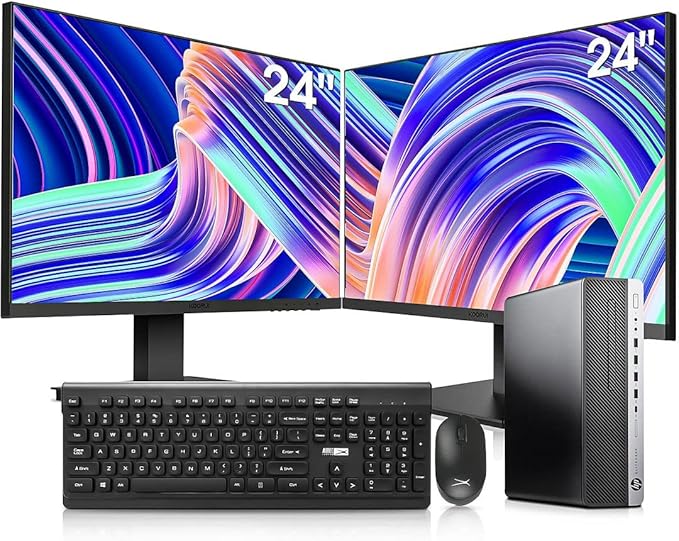 HP Elitedesk 800 G3 SFF Desktop PC – Intel i7-6700,32GB RAM,512GB NVMe SSD + 2TB HDD, Wi-Fi 6 AX200,24-Inch 2 Monitors, Wireless Keyboard & Mouse,Windows 11 (Renewed), Black/Silver