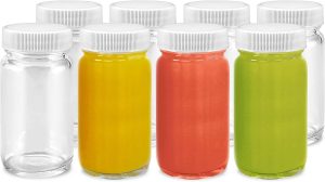 Juice Shot Bottles Set – Wide Mouth for Juicing, Beverage Storage, Liquids, 2 oz, Clear Glass with White Caps, Reusable, Leak Proof, Jars (8 pack)